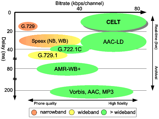 | AAC-LD | 16-48 | 16-128 | from 10 to 11.6 | from 20 to 50+ | packet loss | proprietary, MPEG |